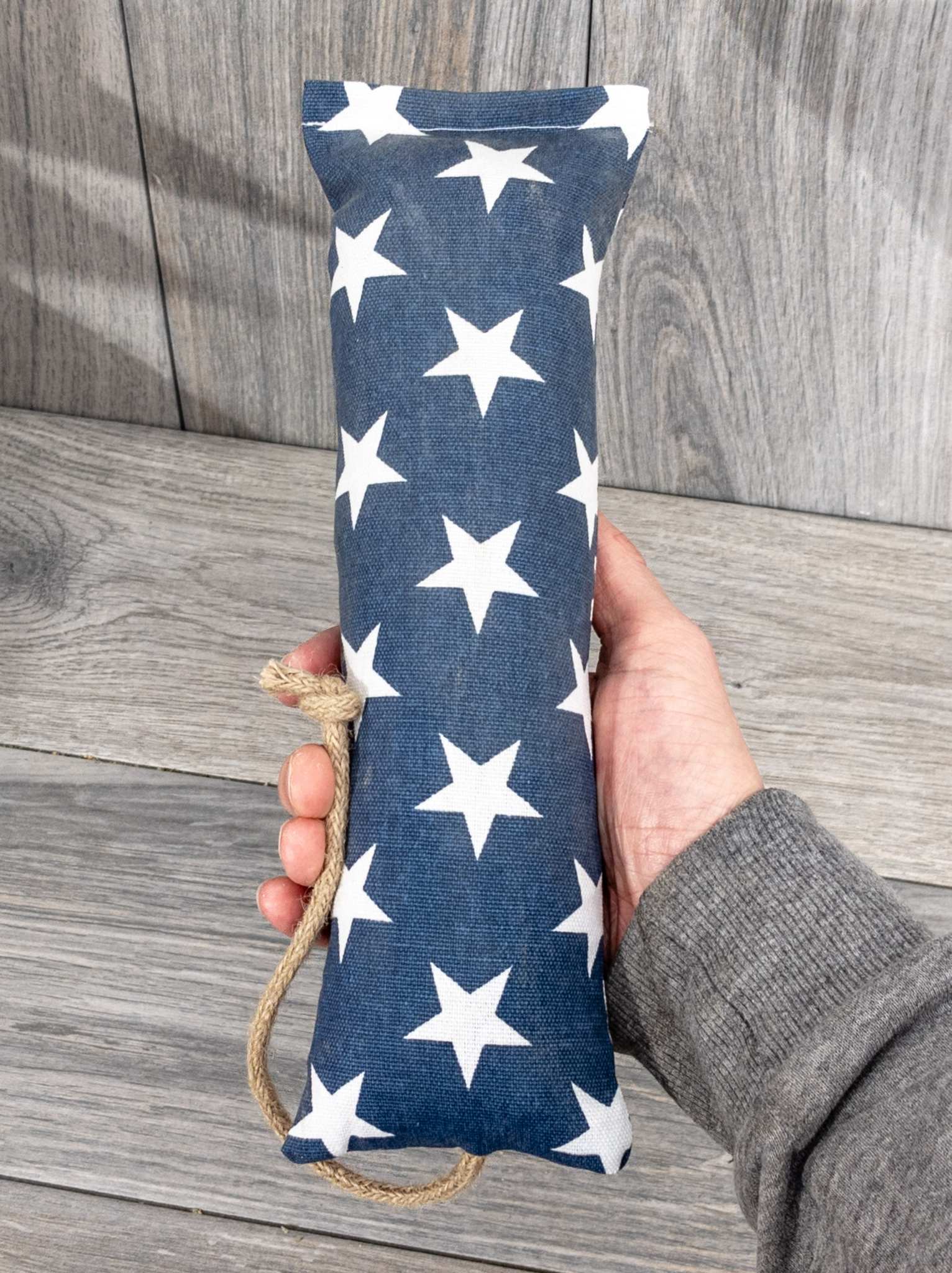 The kickers are 10 inches long (not including tail) and 4 inches around. They are made from tough canvass-y cotton which is also called duck cotton. Kicker is made of fabric shown but there might be slight variations depending on the exact cut used and where the pattern falls.
