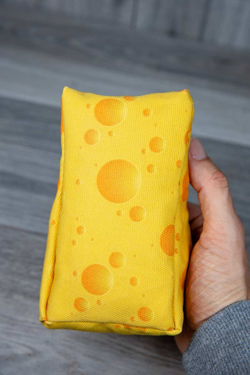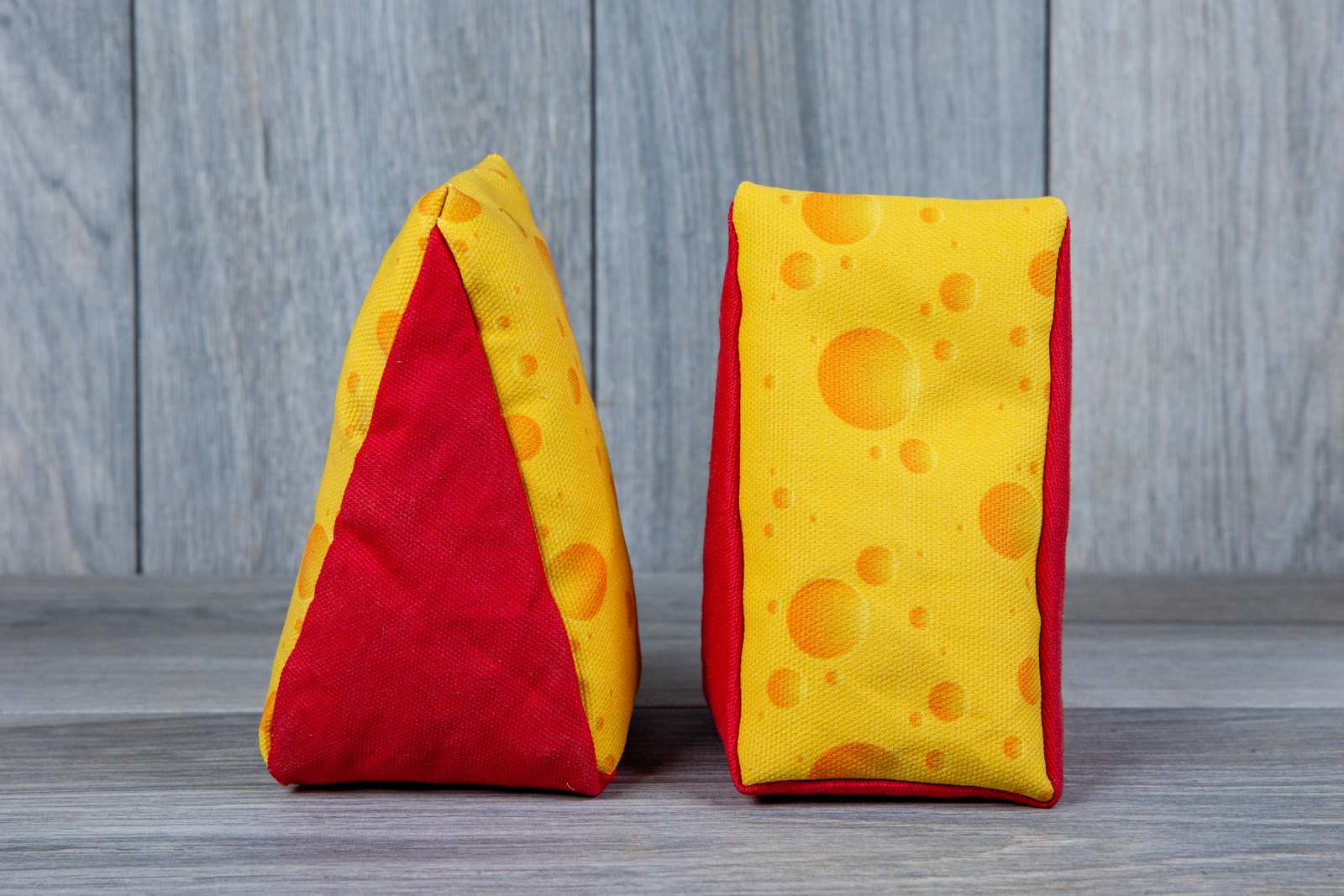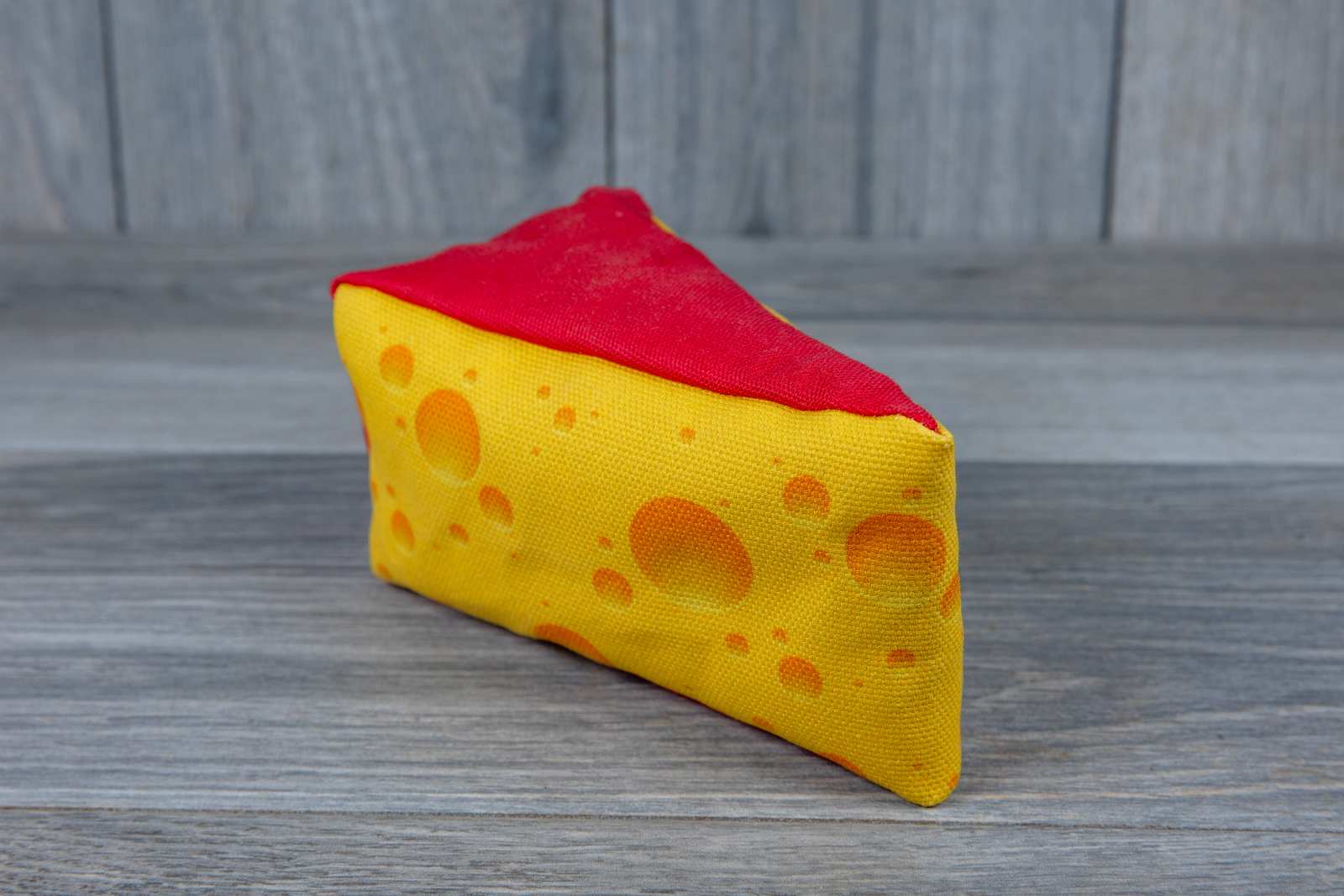 Each cheese toy is hand-made from a tough canvas fabric with digitally printed pattern. You can choose a wedge of solid cheese to have it wrapped in a cartoony red rind.