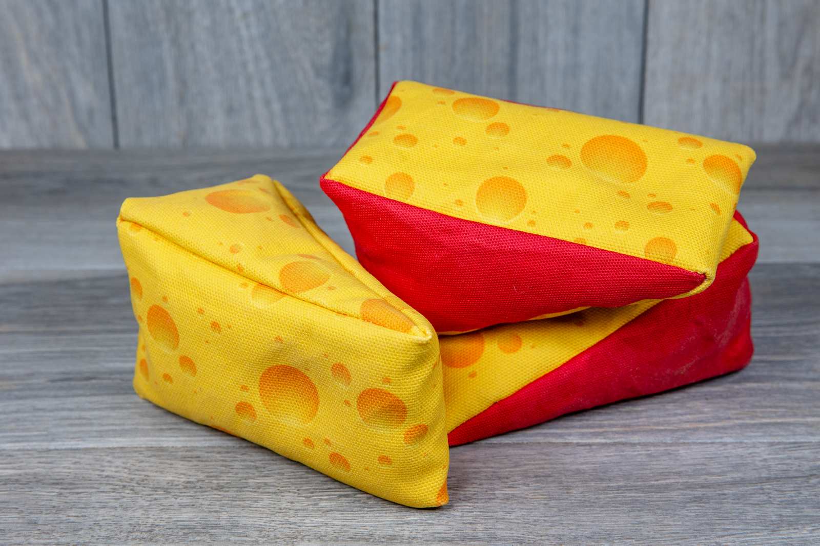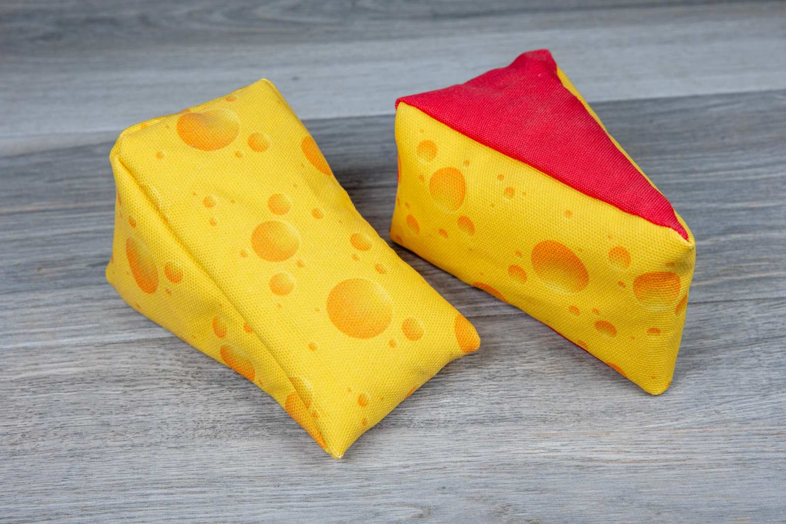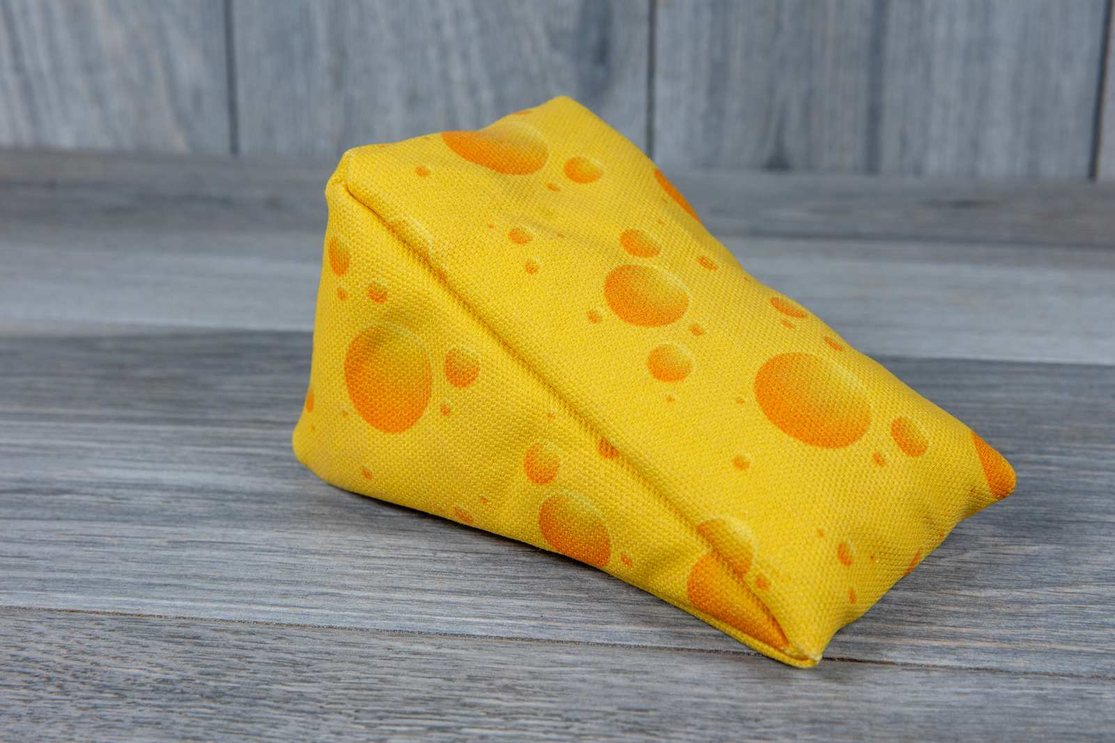 Each cheese toy is hand-made from a tough canvas fabric with digitally printed pattern. You can choose a wedge of solid cheese to have it wrapped in a cartoony red rind.